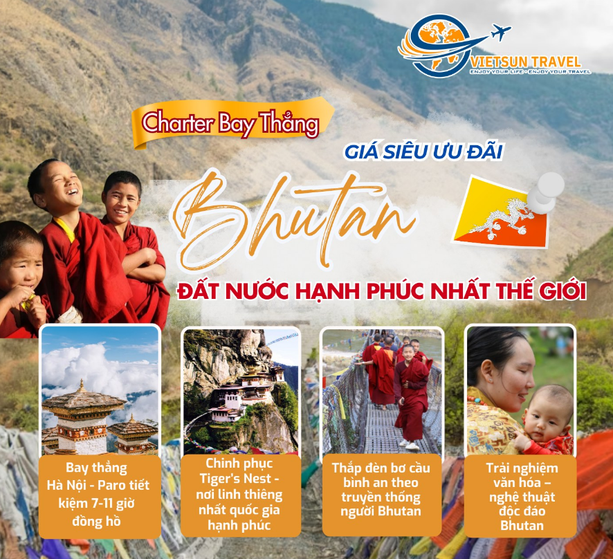 Với sự chuẩn bị chu đáo và kinh nghiệm dày dặn trong các chuyến charter quốc tế, VietSun Travel không chỉ đưa du khách đến Bhutan – mà còn mang đến một chuyến đi của tâm hồn, nơi mỗi người được tìm lại bình yên giữa bầu không khí thanh khiết của đất Phật Himalaya.